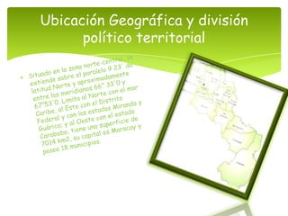 El estado Aragua se encuentra en el centro de Venezuela. Sus símbolos incluyen un escudo con una mujer alada, el Samán de Güere y una casa de azúcar. La economía se basa en la agricultura como el café, maíz y queso, así como la cría de aves, ganado y pesca. La vestimenta tradicional incluye sombreros de paja y guayaberas para los hombres y vestidos de colores para las mujeres. El estado también cuenta con parques nacionales y sitios turísticos como atracciones.