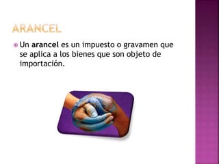 Este documento describe los diferentes tipos de aranceles a las importaciones, incluidos los aranceles ad valorem y específicos. Explica los efectos fundamentales de los aranceles, como incrementar los ingresos del estado, mejorar la balanza comercial, pero también encarecer los productos importados para los consumidores y causar una asignación ineficiente de recursos. Finalmente, señala que los aranceles pueden proteger a las empresas locales pero un exceso de protección puede llevar a la ineficiencia.