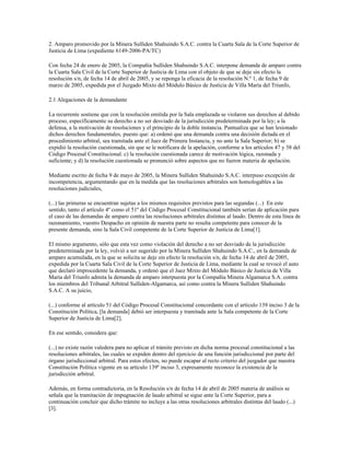 Este documento discute la competencia de los tribunales para conocer demandas de amparo contra resoluciones arbitrales. Se presentan los argumentos de las partes en dos casos acumulados sobre si dichas demandas deben interponerse ante la sala civil de la corte superior o ante un juzgado mixto. El Tribunal Constitucional evalúa si se violaron derechos fundamentales en los procesos y si los tribunales inferiores interpretaron correctamente su competencia.