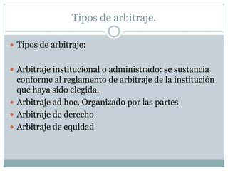 El arbitraje es un procedimiento por el cual las partes someten sus diferencias a un árbitro neutral e independiente. Existen diferentes tipos de arbitraje como institucional o ad hoc. El arbitraje ofrece ventajas como celeridad, economía y confidencialidad. El acuerdo arbitral es crucial y debe establecer elementos como el número de árbitros, lugar y derecho aplicable. El laudo arbitral es la resolución final del tribunal arbitral que pone fin al procedimiento y puede ser reconocido y ejecutado ante los tribunales.