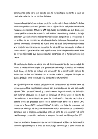 Este documento describe un proyecto de tesis para diseñar y construir un árbol de levas con perfil modificado para mejorar el rendimiento de un motor Chevrolet Alto 2003. El objetivo es desarrollar una metodología para modificar los perfiles de levas estándar sin necesidad de otras modificaciones al motor. El proyecto utilizará un centro de mecanizado CNC de cuatro ejes para construir el nuevo árbol de levas de forma automatizada.