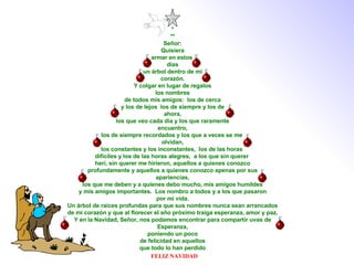El documento habla sobre armar un árbol de navidad dentro del corazón con los nombres de todos los amigos, tanto cercanos como lejanos, del pasado y del presente, para que sus nombres nunca se olviden y para desearles esperanza, amor y paz en la Navidad.
