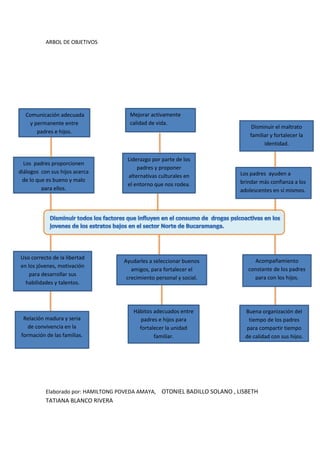 El documento presenta un árbol de problemas y objetivos relacionados con la juventud. El árbol de problemas identifica factores como la curiosidad de los jóvenes, la influencia social negativa, la falta de comunicación entre padres e hijos, la pobreza y el maltrato familiar que pueden conducir a problemas emocionales, rebeldía, consumo de drogas y baja autoestima. El árbol de objetivos propone soluciones como mejorar la comunicación familiar, brindar alternativas culturales positivas, fortalecer la identidad de los jóven