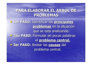 Este documento describe el proceso de análisis de problemas, el cual incluye identificar los problemas principales, definir el problema central, y visualizar las relaciones de causa y efecto a través de un árbol de problemas. Luego, explica cómo elaborar un árbol de objetivos convirtiendo las causas del problema en medios y los efectos en fines, con el fin de establecer una situación futura deseada.