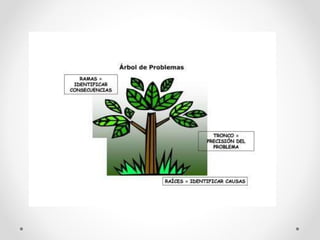 El documento describe los pasos para elaborar un árbol de problemas en investigación, que incluye definir el deber ser, la situación actual, y la brecha entre ambos. Se enfatiza la importancia de identificar los efectos del problema y sus causas, así como diagramar el árbol de causas y efectos. También se menciona la necesidad de revisar la validez del diagrama creado.