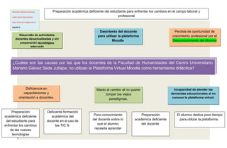 Las principales causas por las que los docentes de la Facultad de Humanidades del Centro Universitario Mariano Gálvez Sede Jutiapa no utilizan la Plataforma Virtual Moodle como herramienta didáctica son: la deficiencia en capacitaciones y orientación a docentes, el miedo al cambio por no querer romper los viejos paradigmas, y la incapacidad de atender las demandas educacionales al no conocer la plataforma virtual.