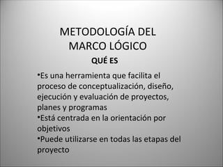 Este documento describe la metodología del marco lógico, que es una herramienta para planificar, ejecutar y evaluar proyectos. Explica que la metodología incluye el análisis del problema, los involucrados, los objetivos y las alternativas de solución. También describe la matriz del marco lógico, que resume el proyecto planificado. Finalmente, detalla los pasos para identificar el problema, los objetivos y la estructura analítica del proyecto propuesto.