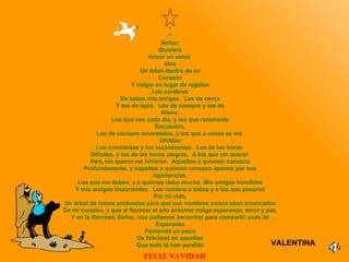 El autor desea construir un árbol de Navidad metafórico dentro de su corazón en el que cuelgue los nombres de todos sus amigos, tanto cercanos como lejanos, constantes e inconstantes, de momentos alegres y difíciles, para que nunca sean olvidados y traigan esperanza, amor y paz en las próximas navidades.