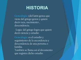 El documento explica que la genealogía es el estudio de la ascendencia y descendencia de una persona o familia. Para realizar una investigación genealógica, se recopilan antecedentes orales y documentales. El árbol genealógico es una herramienta gráfica que representa de forma organizada la información genealógica y ayuda a estudiar cómo se heredan las enfermedades en una familia.