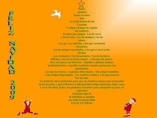 El documento habla sobre armar un árbol de Navidad simbólico dentro del corazón con los nombres de todos los amigos de diferentes tipos, tanto cercanos como lejanos, constantes e inconstantes, de momentos buenos y malos. El árbol tendrá raíces profundas para que los nombres nunca sean olvidados y cada Navidad traiga esperanza, amor, paz y felicidad especialmente para los que lo han perdido todo.