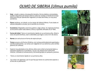 El olmo de Siberia tiene hojas simples y caducas con bordes dentados, flores verdosas sin interés y frutos alados. Crece rápido, alcanza 15 metros, y se usa comúnmente como árbol ornamental a pesar de ser susceptible a insectos. El cedro del atlas tiene hojas compuestas y perennes con forma de aguja, produce piñas y se usa en parques. El pino piñonero también tiene hojas en forma de aguja, produce piñas comestibles y necesita suelo adecuado y mucho sol.