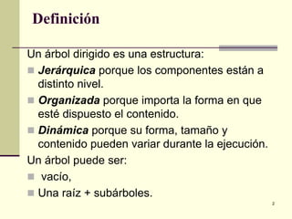 El documento define y explica los conceptos básicos de los árboles binarios de búsqueda. Describe las características de un árbol binario de búsqueda, incluyendo que los nodos a la izquierda del padre deben ser menores y los de la derecha mayores. Explica operaciones como la inserción, eliminación y búsqueda de nodos, así como recorridos de árbol como preorden, inorden y postorden.