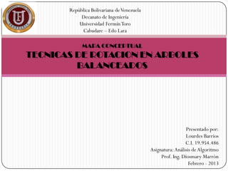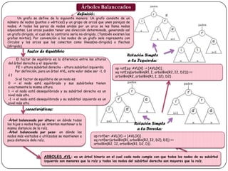Este documento describe las técnicas de rotación en árboles balanceados como los árboles AVL. Explica las rotaciones simples y dobles a la izquierda y derecha que mantienen el equilibrio del árbol cuando se insertan o eliminan nodos. También define los árboles AVL como árboles binarios donde todos los nodos del subárbol izquierdo son menores que la raíz y todos los del derecho son mayores.