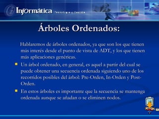 Este documento describe los árboles binarios ordenados y sus operaciones básicas. Explica que los árboles binarios de búsqueda (ABB) mantienen una secuencia ordenada al recorrerlos en in-orden y describen otros tipos de árboles ordenados como AVL y árboles 2-3. Luego detalla cómo implementar las operaciones de búsqueda, inserción y eliminación de elementos en un ABB de forma recursiva, con ejemplos para cada caso de eliminación. Finalmente, propone implementar un árbol binario con