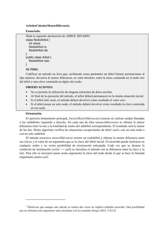 Este documento presenta consideraciones generales sobre árboles binarios y ejercicios de implementación de funcionalidades sobre ellos. Se detallan cuatro ejercicios que implican calcular la menor diferencia entre claves, comprobar si la suma de claves en dos niveles es igual, transformar un árbol en completo e eliminar hojas por debajo de un nivel. Se provee orientación y código para cada ejercicio.