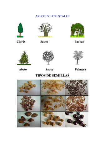 Los árboles forestales más comunes incluyen el ciprés, sauce y baobab. Otros árboles son el abeto, sauce y palmera. El documento también menciona los tipos de semillas.