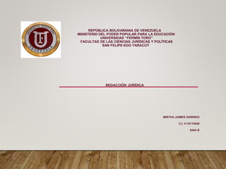 Este documento presenta una lista de figuras retóricas y construcciones gramaticales absolutas del pasado como el hipérbaton, la acumulación de locuciones prepositivas, el arcaísmo y las predicaciones con sujeto modificado sin conexión gramatical con el resto de la oración. El documento fue escrito por Mirtha Jaimes Garrido como parte de un curso de redacción jurídica en la Universidad "Fermín Toro" de Venezuela.