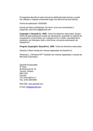 Este documento presenta un tutorial para el uso del sistema de mapeo Target for ArcGIS v2 de Geosoft, el cual permite integrar datos de perforación y superficie en ArcGIS. El tutorial contiene 7 lecciones que cubren la instalación del software, el uso de herramientas de grilla, contorno, perforación, mapas rápidos, secciones e interpretación de datos. También incluye apéndices sobre configuración de preferencias, proyecciones y opciones de control de calidad.