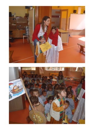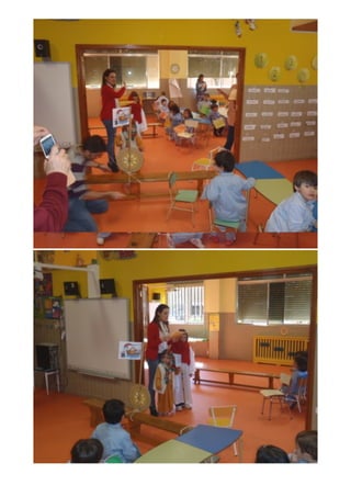 Realizamos en el aula una representación de la historia bíblica del Arca de Noe, entregamos a cada niño y niña alguna pareja de animales, que deberán subir al arca cuando Noe lo indique, mientras ellos tienen que representar ese animal que les ha correspondido. Hemos contado con la colaboración de los padres.