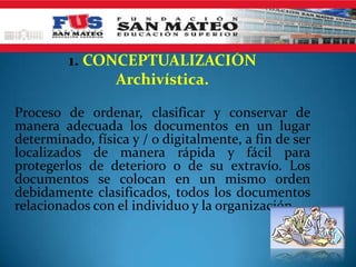 El documento define la archivística como el proceso de ordenar, clasificar y conservar documentos de manera física o digital para protegerlos y facilitar su localización. Explica que los archivos cumplen funciones de administración, desarrollo cultural e histórico, y desarrollo científico. Asimismo, presenta los principales tipos de archivos como los de gestión, intermedios e históricos, y describe los principios éticos que rigen el trabajo archivístico.