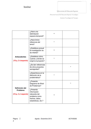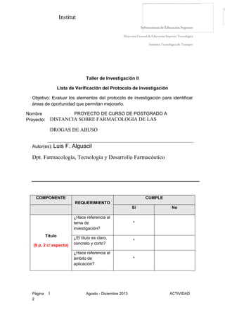 Este documento presenta una lista de verificación para evaluar los elementos de un protocolo de investigación sobre un proyecto de curso de posgrado a distancia sobre farmacología de las drogas de abuso. La lista de verificación contiene componentes como el título, antecedentes, definición del problema, justificación, objetivos, hipótesis, alcances y limitaciones, marco teórico, y bosquejo del método. Al aplicar la lista de verificación al protocolo, se determinó que cumple con todos los requisitos necesarios para la estructura