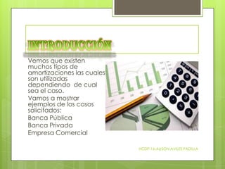 El documento describe los tipos de amortización utilizados por la banca pública, privada y empresas comerciales. Luego, presenta un ejemplo de tabla de amortización de la Corporación Financiera Nacional para créditos de vivienda, incluyendo políticas como plazos de hasta 15 años, montos de hasta $80,000, y tasas de interés ajustables cada 180 días. Finalmente, explica que aunque la amortización es de pagos iguales y periódicos, la tasa de interés puede modificarse cada 6 meses alterando la mensualidad.