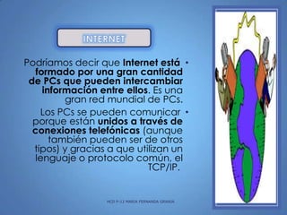 El documento describe las características fundamentales de Internet. Internet está formado por una red mundial de ordenadores (PCs) que pueden intercambiar información a través de conexiones telefónicas utilizando el protocolo TCP/IP. La información disponible en Internet reside en servidores pertenecientes a universidades, instituciones y empresas.