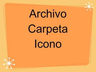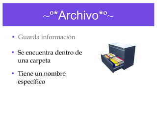 Un archivo guarda información dentro de una carpeta con un nombre específico, una carpeta guarda archivos y tiene un nombre distintivo, y un icono ejecutable representa gráficamente un programa y al dar doble clic lo abre.