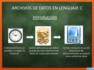 Este documento describe los archivos de datos en lenguaje C. Explica que un archivo de datos es una colección de registros relacionados organizados para un propósito específico. Detalla que C maneja archivos como secuencias de datos que fluyen entre un origen y un destino a través de una conexión. Finalmente, cubre conceptos como el puntero de archivo, la apertura, cierre y creación de archivos, y las funciones para leer y escribir datos en archivos.