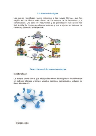 El documento describe las nuevas tecnologías, caracterizadas por su inmaterialidad, interconexión y capacidad de almacenamiento masivo. Discute cómo estas tecnologías han permitido nuevos lenguajes y formas de expresión. También explica cómo las nuevas tecnologías, especialmente Internet y las herramientas Web 2.0, se han aplicado cada vez más en la educación para ampliar el aprendizaje más allá del aula y facilitar la comunicación y colaboración entre estudiantes y profesores.