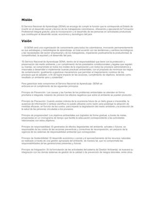 El Servicio Nacional de Aprendizaje (SENA) tiene la misión de ofrecer formación profesional gratuita a los trabajadores colombianos para contribuir al desarrollo del país. Su visión es ser una organización innovadora que se adapte a los cambios tecnológicos y las necesidades del sector empresarial. El SENA se compromete a implementar prácticas ambientales sostenibles basadas en principios como la prevención, precaución y responsabilidad.