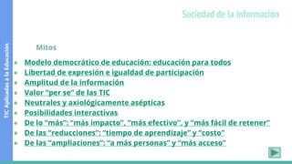 El documento presenta una lista de mitos comunes sobre las tecnologías de la información y la comunicación (TIC) aplicadas a la educación. Algunos de los mitos discutidos incluyen que las TIC pueden sustituir a los profesores, que proporcionan un acceso igualitario a la información, y que siempre mejoran el aprendizaje. El documento argumenta que las TIC son simplemente herramientas y que depende de cómo se utilicen para apoyar realmente la enseñanza y el aprendizaje.