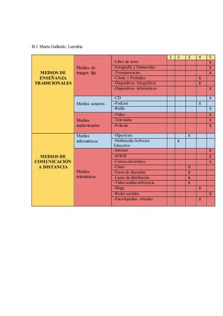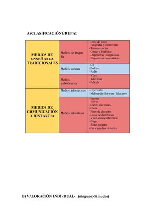 El documento clasifica y valora diferentes medios de enseñanza tradicionales y medios de comunicación a distancia. Agrupa los medios de enseñanza tradicionales en medios de imagen fija, sonoros y audiovisuales, y los medios de comunicación a distancia en medios informáticos y telemáticos. Se evalúa el valor de cada medio en una escala del 1 al 5.