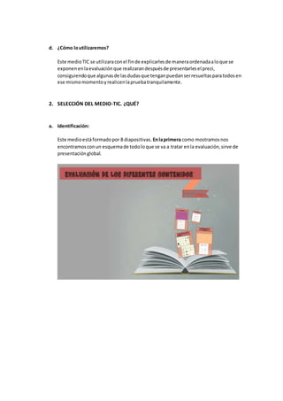 Este documento presenta una guía didáctica para utilizar Prezi como medio TIC para evaluar a estudiantes de segundo grado de primaria. Incluye 8 diapositivas con actividades para evaluar nombres con sílabas, nombres individuales y colectivos, onomatopeyas y partes de una entrevista. También describe actividades antes, durante y después para motivar a los estudiantes y asegurar la comprensión de los contenidos.