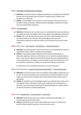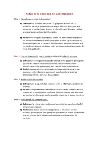 El documento resume 15 mitos comunes sobre la sociedad de la información y la educación. Algunos de los mitos discutidos incluyen que las TIC proporcionan una educación más democrática y de mayor calidad para todos, que permiten la libertad de expresión y participación igualitaria, y que pueden resolver todos los problemas educativos. Sin embargo, el documento analiza que cada uno de estos mitos ignora factores como la brecha digital, las limitaciones cognitivas de algunos estudiantes, y que las TIC deben usarse junto con otros elementos del plan de estudios