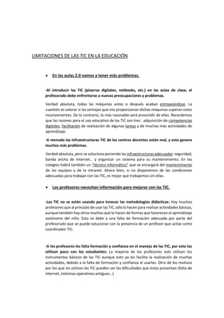 El documento describe las posibilidades y limitaciones de las tecnologías de la información y la comunicación (TIC) en la educación. Entre las posibilidades se encuentran la diferenciación de contenidos, la ruptura de la linealidad expresiva y los nuevos códigos y lenguajes. Sin embargo, también existen desafíos como la falta de formación de los profesores, las distracciones de los estudiantes y la necesidad de establecer prioridades ante los altos costos de las TIC.