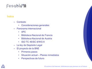 El documento resume los esfuerzos de varias bibliotecas nacionales para archivar sitios web y preservar el patrimonio digital de Internet. Describe iniciativas internacionales como la IIPC, y los enfoques de la Biblioteca Nacional de Francia y Austria. También resume los pasos iniciales, situación actual y planes futuros del proyecto de archivado web de la Biblioteca Nacional de España para recolectar, preservar y proveer acceso al dominio .es.