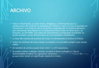 El documento describe los conceptos básicos de archivos y directorios en Linux, incluyendo la estructura de directorios, nombres y tipos de archivos, y comandos para navegar entre directorios como pwd y cd. Explica que los archivos se almacenan en directorios de manera jerárquica con la raíz "/" en la cima, y que los usuarios tienen acceso de lectura y escritura a sus propios directorios personales, pero no a los de otros usuarios.