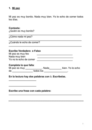 Este documento contiene 12 lecturas cortas sobre diferentes temas como animales, objetos y personas. Cada lectura incluye preguntas de comprensión lectora y ejercicios de completar oraciones y palabras. El documento proporciona material para practicar y evaluar las habilidades de lectura y vocabulario en estudiantes.