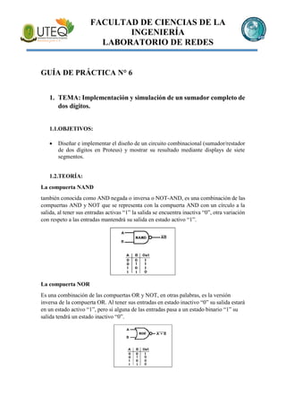 Este documento presenta una guía de práctica sobre la implementación y simulación de un sumador completo de dos dígitos en el software Proteus. El objetivo es diseñar un circuito combinacional que pueda sumar o restar dos números de dos dígitos en código binario decimal y mostrar el resultado en displays de siete segmentos. Se explican conceptos teóricos como las compuertas NAND, NOR y XOR necesarias para el diseño. El estudiante debe implementar el sumador usando compuertas lógicas, incluyendo un ajuste