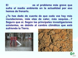 El documento describe el cambio climático como el problema ambiental más grave actualmente y explica que está causado por la actividad humana. Los gases de efecto invernadero están causando que la Tierra se caliente más de lo normal, lo que tiene varios efectos negativos como el derretimiento del hielo polar, el aumento del nivel del mar e incremento de fenómenos meteorológicos extremos. Se insta a la gente a tomar medidas como ahorrar energía, usar transporte público y reciclar para ayudar a frenar el cambio climático.