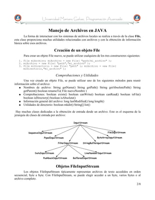 Este documento describe los métodos para manejar archivos en Java, incluyendo la creación de objetos File, la lectura y escritura de archivos mediante FileInputStream, FileOutputStream, DataInputStream y DataOutputStream, y el acceso aleatorio a archivos usando RandomAccessFile. Explica cómo abrir, leer, escribir y cerrar archivos, así como obtener información sobre ellos.
