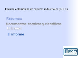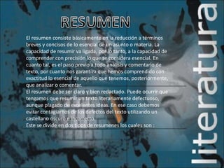 Este documento habla sobre los diferentes tipos de resúmenes y sus características. Explica que hay dos tipos principales de resúmenes: uno que sintetiza el contenido del texto original y otro que explica la estructura del escrito. También menciona que el resumen debe ser claro, breve y bien redactado para transmitir la información esencial de manera concisa.