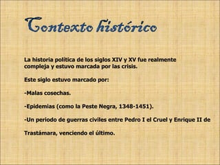 El documento resume la vida y obra de Juan Ruiz, conocido como el Arcipreste de Hita. Vivió en el siglo XIV durante un periodo de crisis políticas y económicas en España. Escribió su única obra, El Libro de Buen Amor, donde narra sus intentos de seducción y aventuras amorosas de forma autobiográfica. La obra ofrece detalles sobre la sociedad y costumbres de la época a través de las distintas clases sociales y personajes que aparecen.