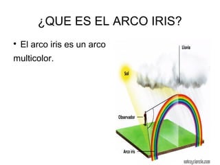 El arco iris es un arco multicolor formado por la refracción, reflexión e interferencia de la luz del sol al pasar a través de las gotas de agua en el aire. Se compone de los colores rojo, naranja, amarillo, verde, azul, añil y violeta, con el rojo en el exterior y el violeta en el interior.