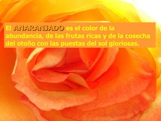 El   ANARANJADO   es el color de la  a bundancia, de las frutas ricas y   de la cosecha del otoño con las puestas del sol gloriosas.