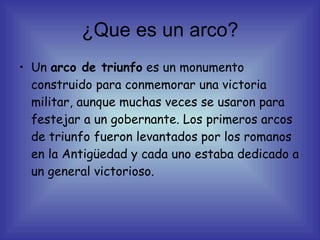 El documento describe diferentes arcos romanos alrededor del mundo, incluyendo su origen, ubicación y propósito. Los arcos romanos se originaron en la antigua Roma para celebrar victorias militares y fueron estructuras temporales. Más tarde durante el Imperio Romano se erigieron arcos permanentes dedicados a emperadores y generales victoriosos como el Arco de Constantino en Roma y el Arco de Trajano en Benevento, Italia. Otros arcos no romanos pero inspirados en la tradición romana incluyen el Arco de Car
