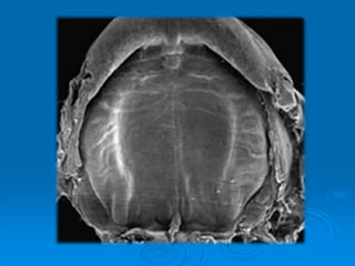 El documento describe el desarrollo de los arcos branquiales y sus estructuras asociadas durante las primeras semanas de desarrollo embrionario. Los arcos branquiales aparecen entre la cuarta y quinta semana y dan origen a componentes musculares, óseos y nerviosos de la cabeza y cuello. El primer arco da origen a estructuras de la mandíbula inferior, el segundo al estribo y otros huesos del oído medio, y los siguientes tres arcos a cartílagos de la laringe y estructuras