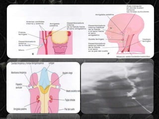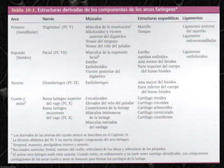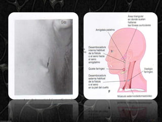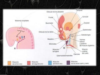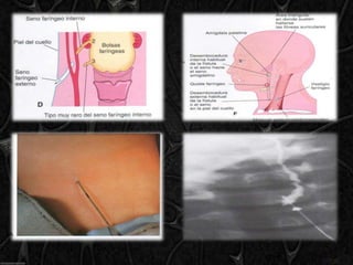 El documento describe el desarrollo de los arcos faríngeos y las bolsas faríngeas durante las primeras semanas de desarrollo embrionario. Los arcos faríngeos dan origen a estructuras craneofaciales como los cartílagos de la cara y el cuello. Las bolsas faríngeas dan origen a órganos como las amígdalas, el timo y las glándulas paratiroides. El documento también explica las correlaciones anatómicas y las anomalías que pueden ocurrir cuando se altera el desarrol
