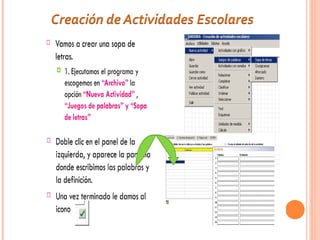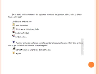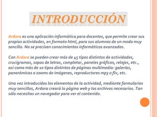 Ardora es una aplicación educativa que permite a los profesores crear fácilmente actividades en formato HTML para sus estudiantes sin necesidad de conocimientos avanzados de informática. Con Ardora se pueden crear más de 45 tipos de actividades como crucigramas, sopas de letras y paneles gráficos. Una vez creadas las actividades a través de formularios sencillos, Ardora genera automáticamente la página web y los archivos necesarios para que los estudiantes puedan acceder al contenido a través de un navegador.